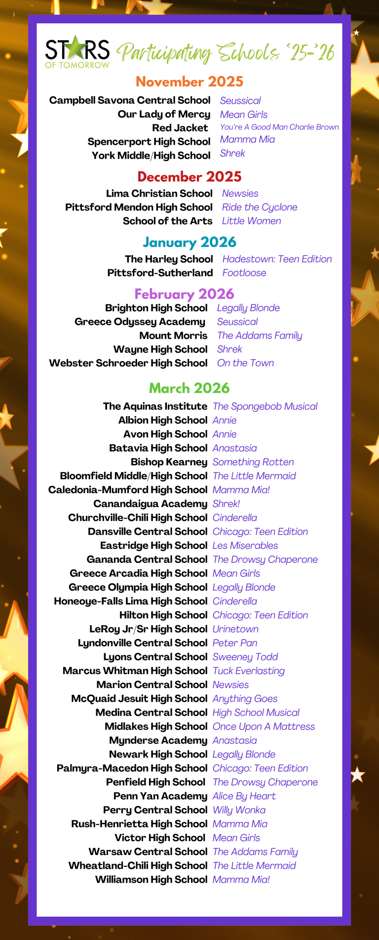 At the annual Stars of Tomorrow Recognition Ceremony, participating schools have the opportunity to perform a selection from their musical on stage at the Auditorium Theatre. Recognition is given to schools with the highest scores in each of the adjudicated categories, and students are given a chance to shine. Additionally, select students recognized for leading roles at the Stars of Tomorrow Ceremony are eligible to compete in Stars of Tomorrow NYC Bound for the chance to represent Rochester, NY, at the National High School Musical Theatre Awards.