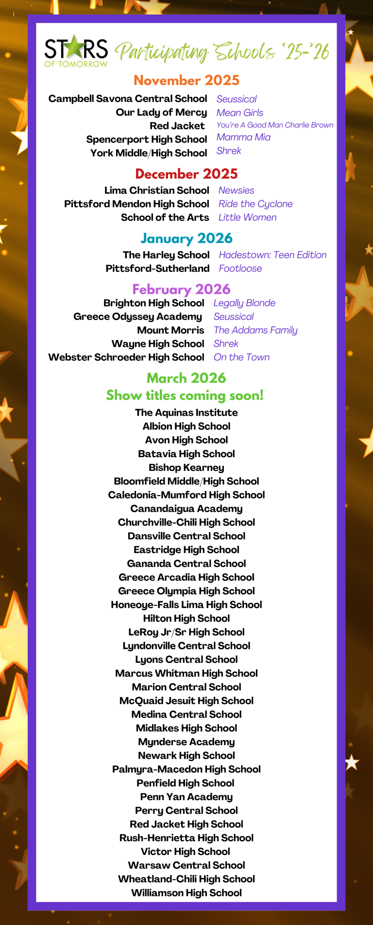 At the annual Stars of Tomorrow Recognition Ceremony, participating schools have the opportunity to perform a selection from their musical on stage at the Auditorium Theatre. Recognition is given to schools with the highest scores in each of the adjudicated categories, and students are given a chance to shine. Additionally, select students recognized for leading roles at the Stars of Tomorrow Ceremony are eligible to compete in Stars of Tomorrow NYC Bound for the chance to represent Rochester, NY, at the National High School Musical Theatre Awards.